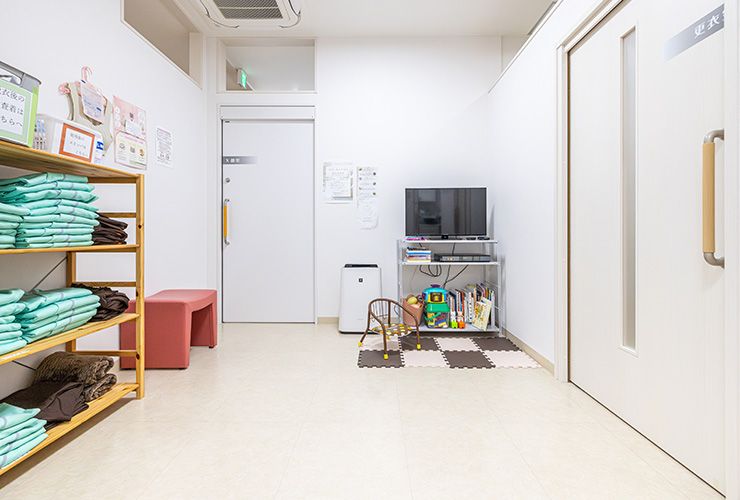 女性専用待合室からは診察室と検査室に直接出入りできるので、一般待合室の患者様の目を気にせず受診することが可能です。また小さなお子様連れでも安心してお越しいただけるよう、おもちゃや子ども向けのビデオなども備えています。男性のお連れ様は女性専用待合室に入れませんが、別の入り口から診察室にご案内し、一緒に説明を聞いていただくことも可能です。